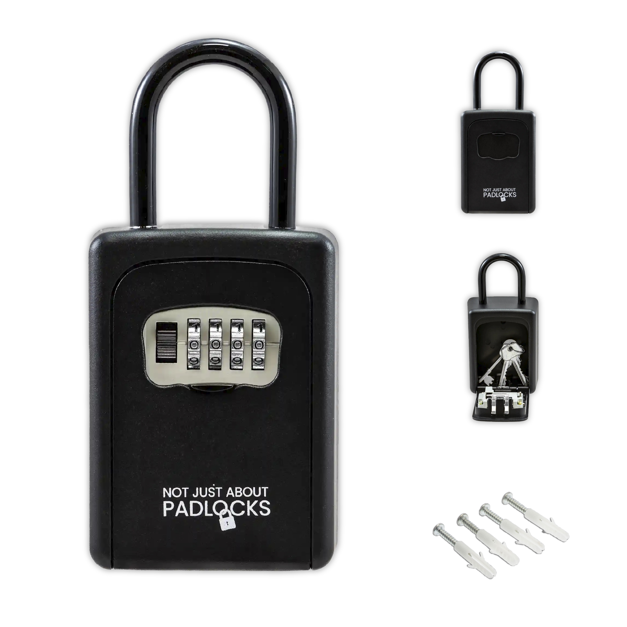 Heavy-duty aluminium alloy key safe with 4-digit combination lock and shackle. Resists prying, hammering, and sawing.